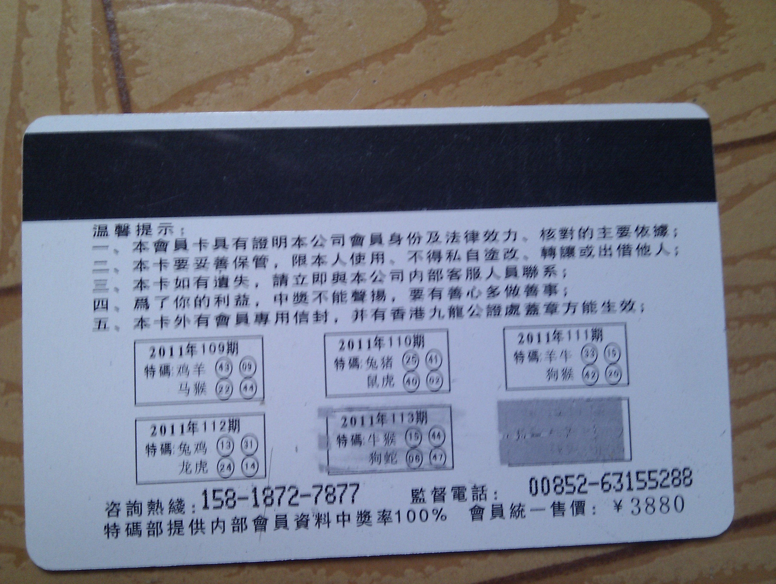 打开一看,里面是一张香港六合彩VIP会员卡及一位市民花费8000元购买彩票的收款收据,会员卡的背面是一些说明,以及一个手机号,还有一个香港那边的电话号码.并注明会员卡办理费用是3880元.我第一反应就是这肯定是骗子的新手法.,没想到流行到电白来了.于是我回来上网百度了一下,果然是有这样的骗子在.下面是相关报道, 列出来希望广大市民引以为戒,因为现在整个电白几乎都在买六合彩,如果遇到一些SB,很容易上当的!