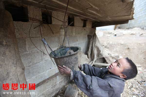 穿洞村在自然条件差而导致了物资贫穷的同时,落后的思想观念也进一步加剧了贫穷的延续。对子女教育不重视,早婚早育、认为多生孩子好等思想很普遍,特别是喝酒的男人整天迷恋醉熏熏的生活,有些人为了喝酒而想尽办法,甚至变卖家中的口粮买酒喝。本村约有200名在校学生,另外有60名学龄儿童辍学在家。(本图中的小朋友忙着帮大人喂猪食,他的爸爸妈妈也没有让他接受教育的想法)
