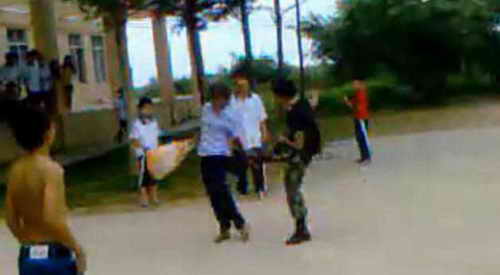 另一段视频上可以看到,过百的学生在围观起哄,其中不少男学生光着上身,穿着拖鞋。一名学校领导样子的中年男子在一旁解释,可是这名妇女根本不听,还不时和“迷彩服”男子发生身体上的接触,但是这时“迷彩服”男子更多的是躲避,基本没有还手。视频的最后,这名妇女还在学校警务室门口不停地“讨公道”。
