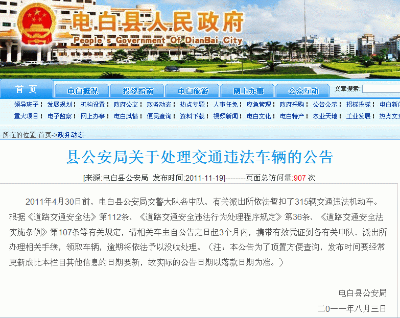 关于《县公安局关于处理交通违法车辆的公告》发布日期的说明