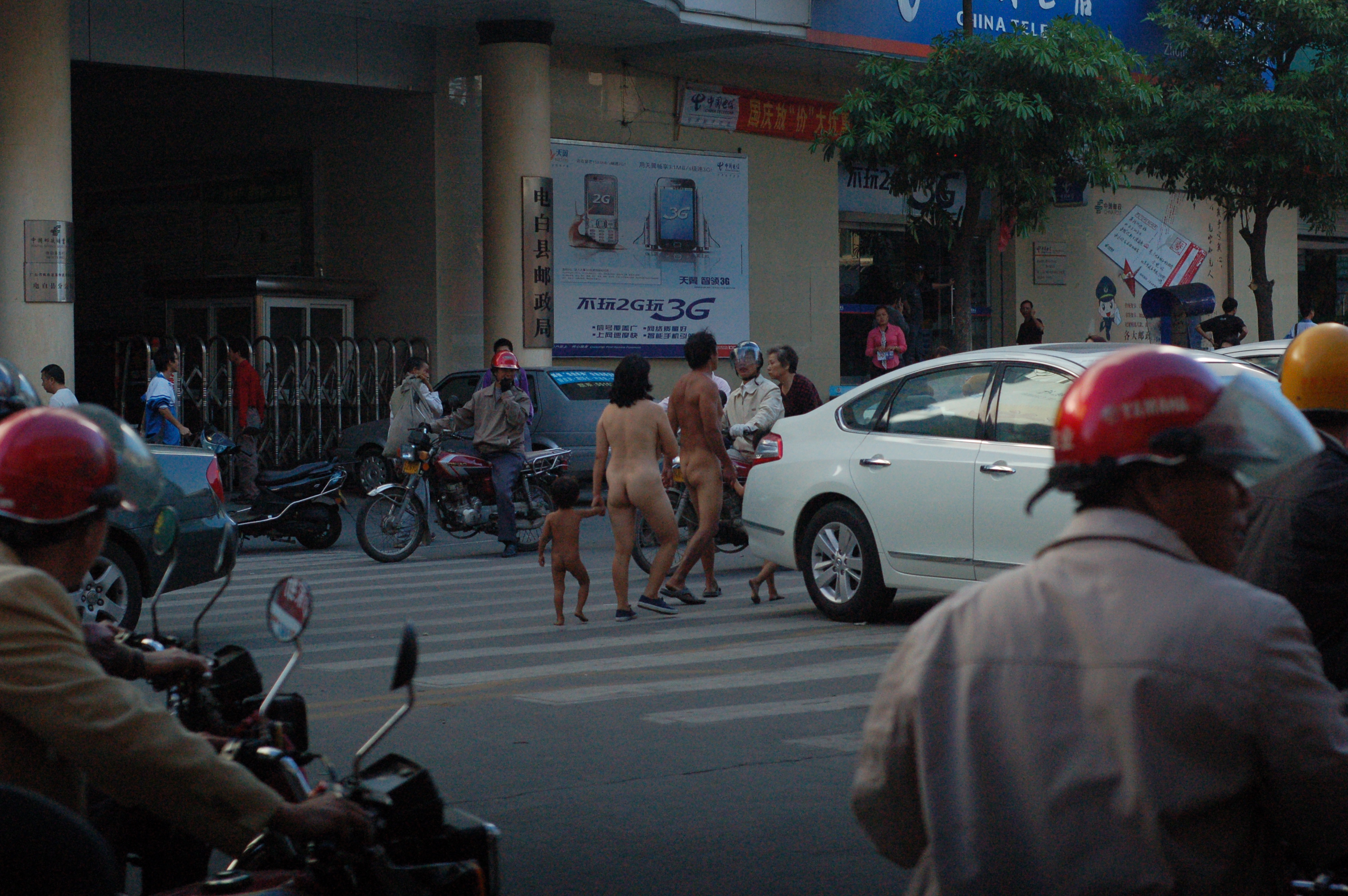 今日下午4时许,电白县公安局110接到群众报警称:有一男一女携2小孩在县城水东镇人民路上裸体徒步行走, 引发路人围观。接警后,警方迅即介入调查处理。