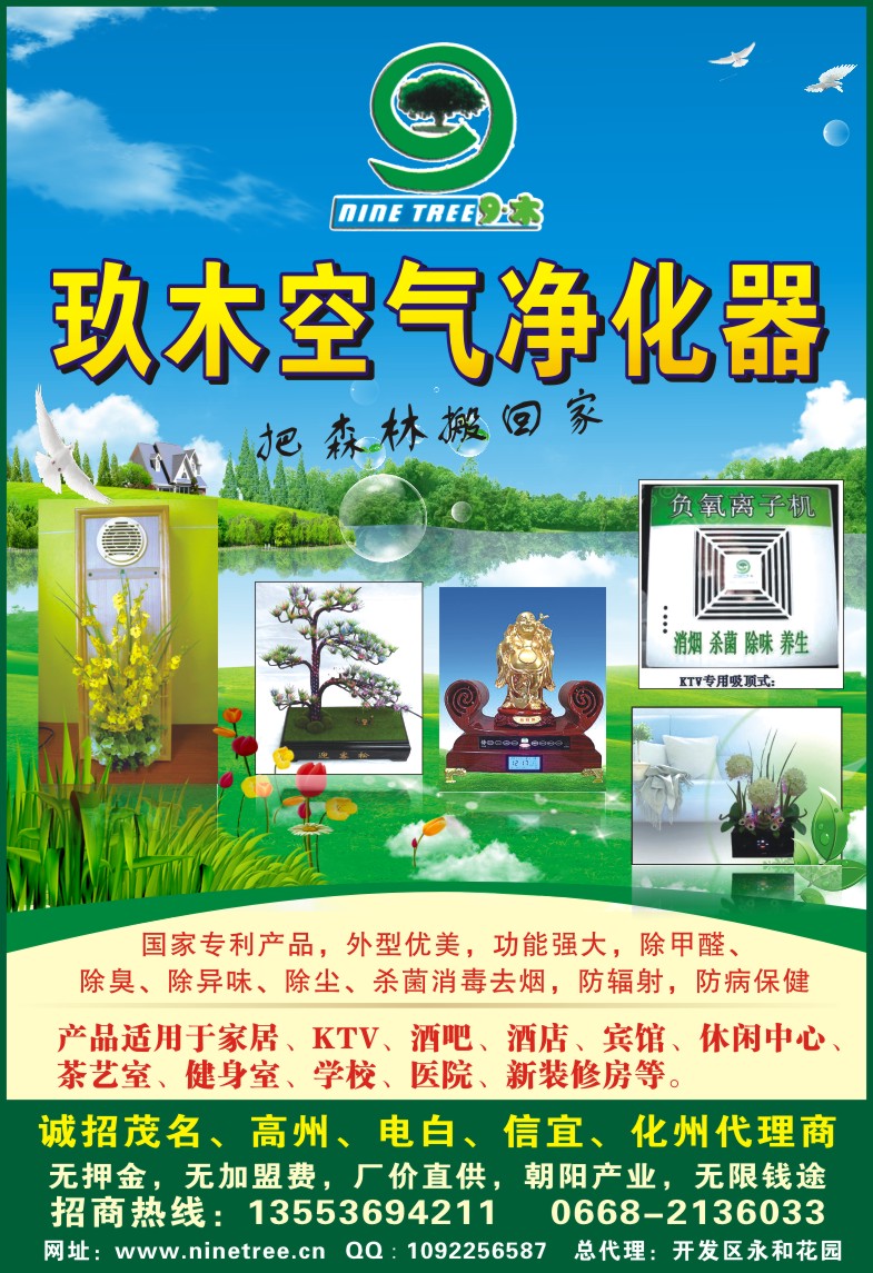 玖木空气净化器,国家专利产品,外型优美,功能强大,适用范围广,朝阳产业,厂价直供.现在电白招代理商一名,招商热线:13553694211,0668-2136033.QQ:1092256587,网址:www.mm9mu.com茂名总代理地址:茂名市茂南开发区永和花园.