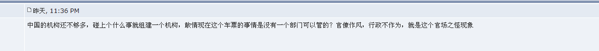 中国的机构还不够多,碰上个什么事就组建一个机构,敢情现在这个车票的事情是没有一个部门可以管的?官僚作风,行政不作为,就是这个官场之怪现象