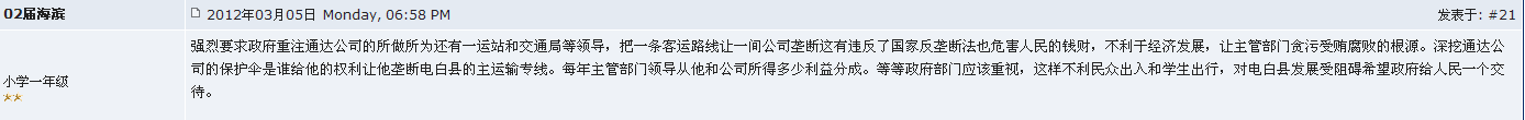 强烈要求政府重注通达公司的所做所为还有一运站和交通局等领导,把一条客运路线让一间公司垄断这有违反了国家反垄断法也危害人民的钱财,不利于经济发展,让主管部门贪污受贿腐败的根源。深挖通达公司的保护伞是谁给他的权利让他垄断电白县的主运输专线。每年主管部门领导从他和公司所得多少利益分成。等等政府部门应该重视,这样不利民众出入和学生出行,对电白县发展受阻碍希望政府给人民一个交待。