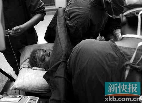 ■昨日,茂名见义勇为的英雄潘权普在广东省中医院大学城分院进行手术,医生将残留在他身体内的38颗弹片取出。