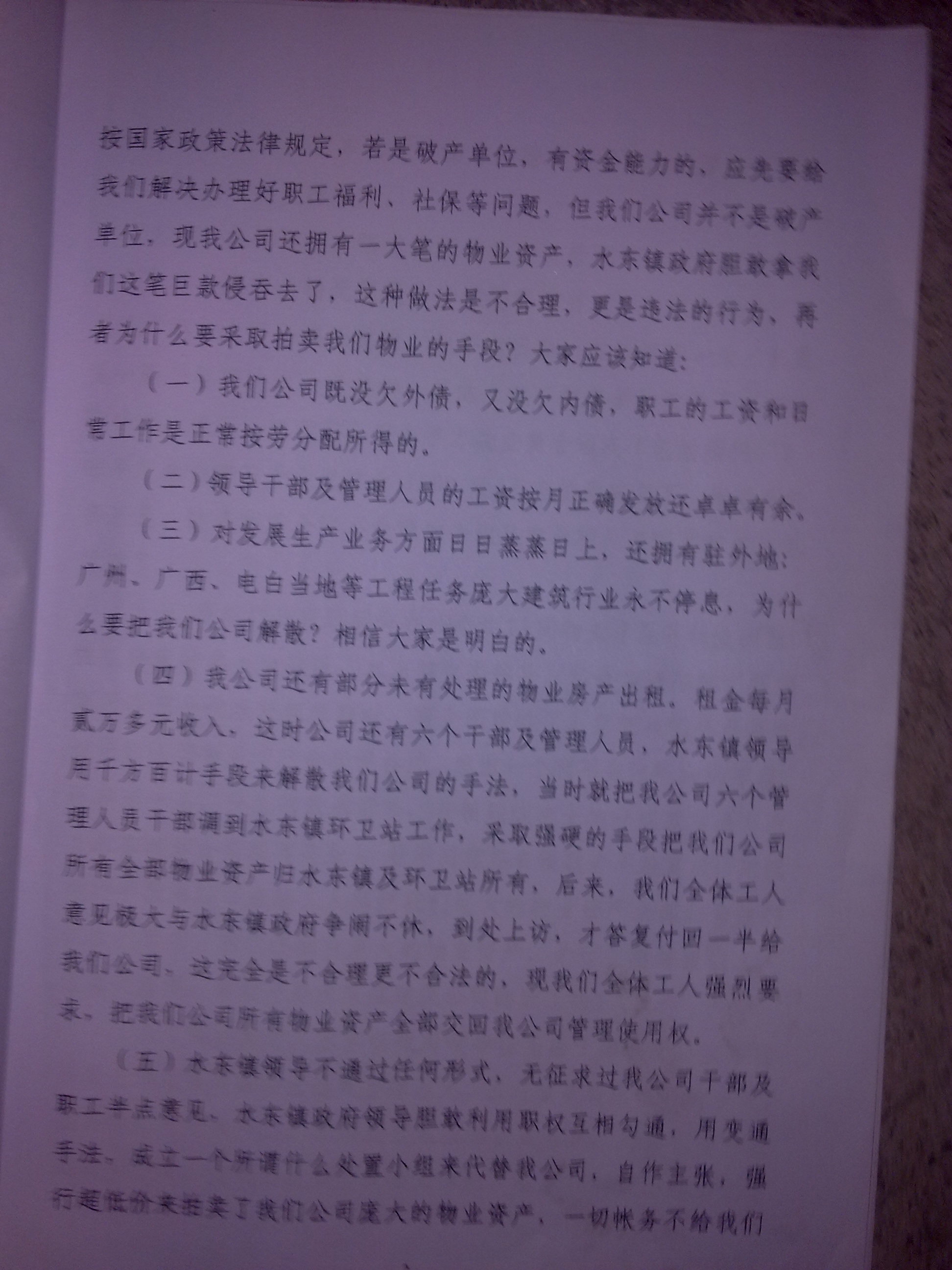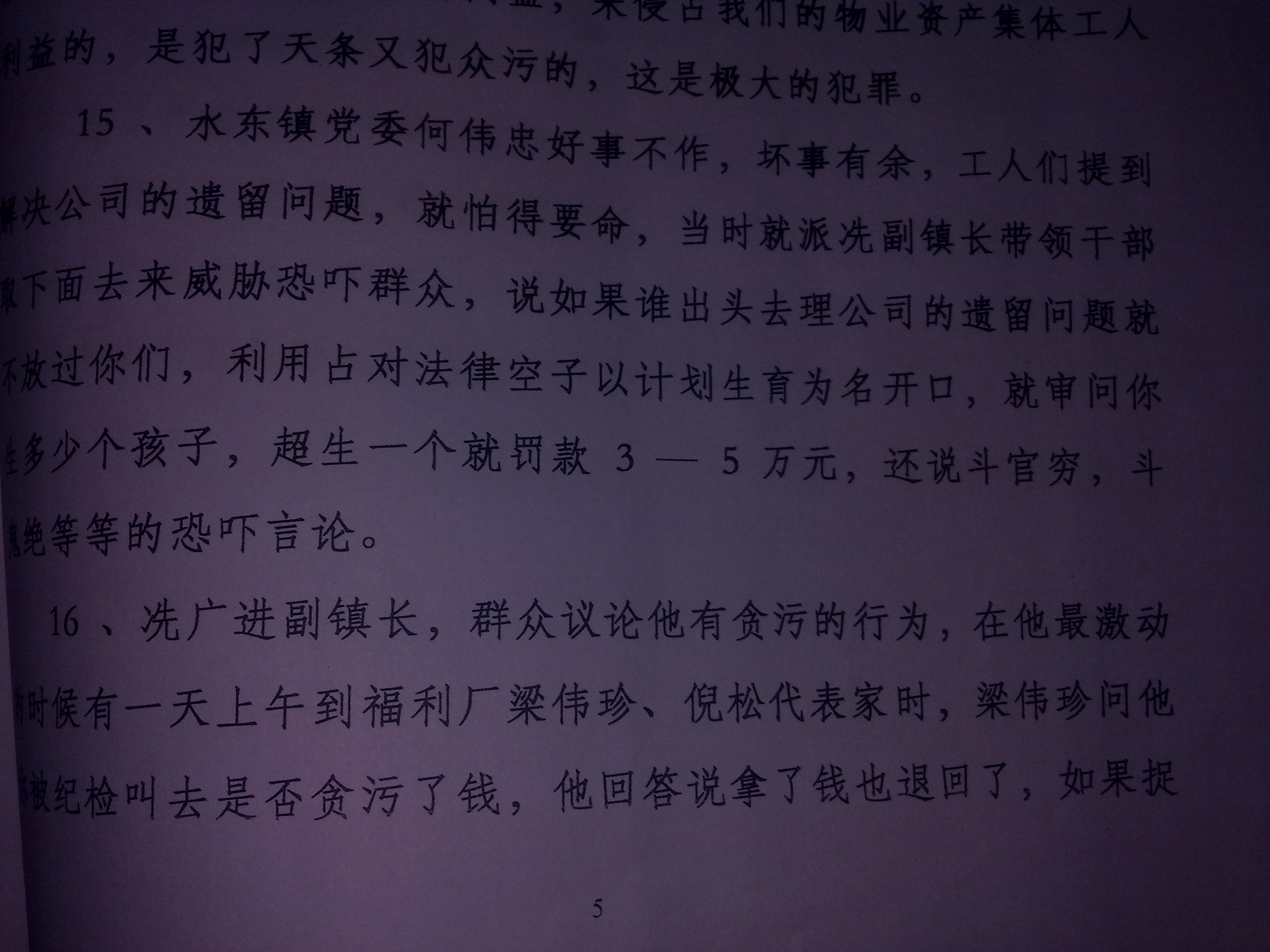2007年何伟忠书记以水东镇政府的名义,非法刻有一个"水东镇处置小组"的公章,自作主张把我们(包括福利厂)拥有的七千多平米黄金商铺,当时价值三千多平方米作价1300\平方米拍卖,得款524万。然后何伟忠强行要与我们对半分成,从中非法夺取262万元私分。