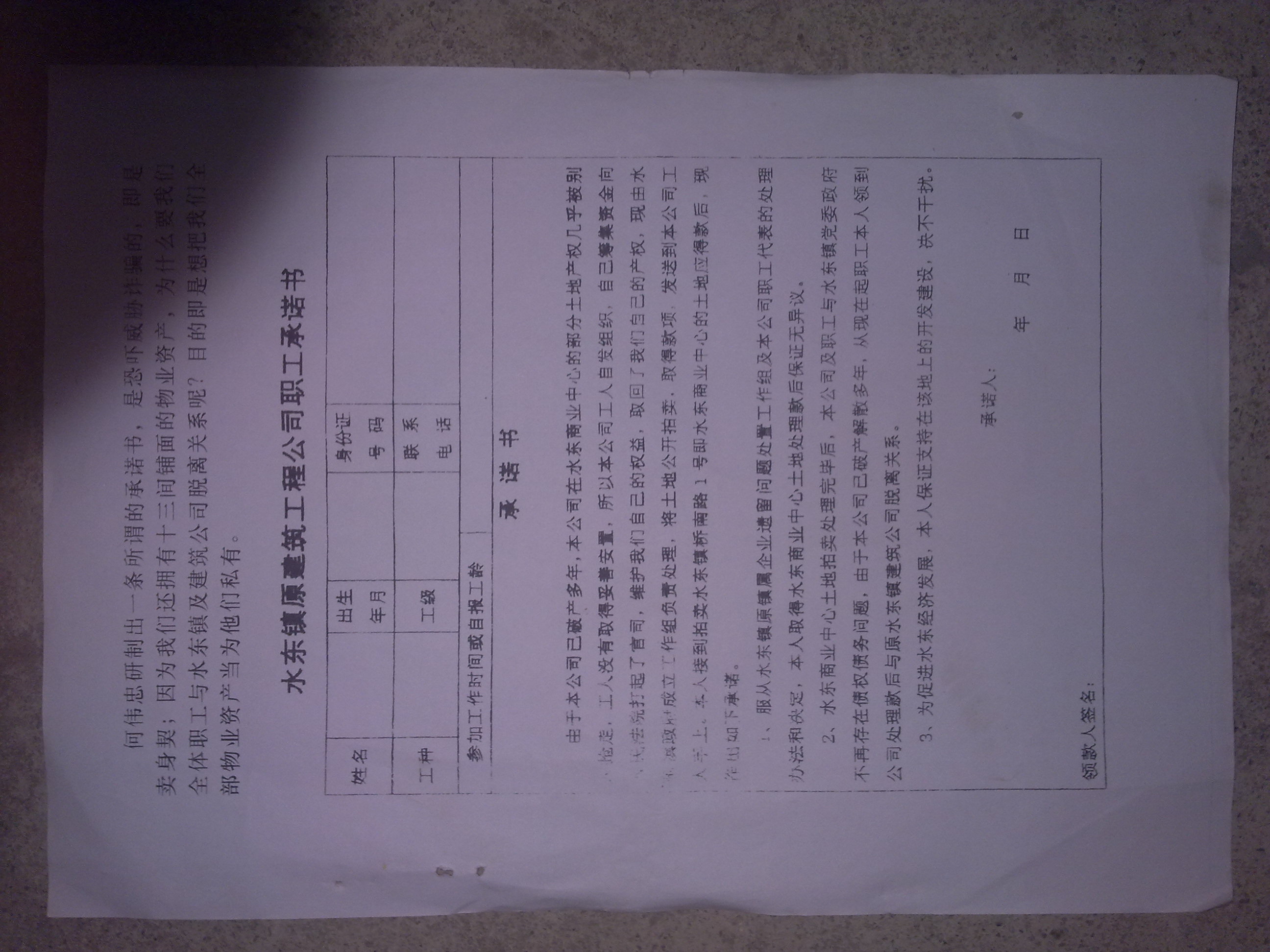 这二项拍卖均没有经过评估程序及职工大会通过。更有甚者,把13间铺先卖掉以后,再对职工挨家逐户派送2000多元。并且要在"承诺书"书上强迫签名,永远脱离公司,对不签名者进行恐吓,批判等手段。