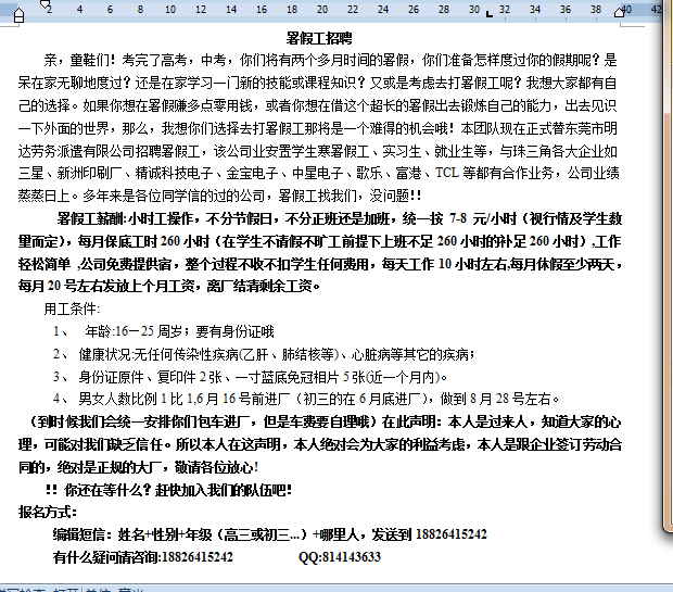 亲,童鞋们!考完了高考,中考,你们将有两个多月时间的暑假,你们准备怎样度过你的假期呢?是呆在家无聊地度过?还是在家学习一门新的技能或课程知识?又或是考虑去打暑假工呢?我想大家都有自己的选择。如果你想在暑假赚多点零用钱,或者你想在借这个超长的暑假出去锻炼自己的能力,出去见识一下外面的世界,那么,我想你们选择去打暑假工那将是一个难得的机会哦!本团队现在正式替东莞市明达劳务派遣有限公司招聘暑假工,该公司业安置学生寒暑假工、实习生、就业生等,与珠三角各大企业如三星、新洲印刷厂、精诚科技电子、金宝电子、中星电子、歌乐、富港、TCL等都有合作业务,公司业绩蒸蒸日上。多年来是各位同学信的过的公司,暑假工找我们,没问题!!