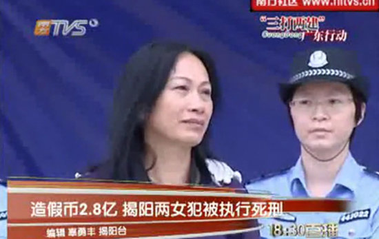 另据羊城晚报报道:揭阳市中级人民法院根据最高人民法院院长签发的执行死刑命令, 依法宣判伪造货币、掩饰、隐瞒犯罪所得罪犯吴玉玲(女,惠来籍,49 岁) 和伪造货币罪犯方瑞凤(女,惠来籍,38 岁) 死刑并执行。吴玉玲、方瑞凤二人是揭阳2009 年破获的“4・10”特大假币案件的主犯。2009 年4 月10日,揭阳市公安机关获得重要线索:一个以方瑞凤等为首、在该市惠来县猖狂伪造货币的犯罪团伙正密谋将大批量的假币移仓。在广东省公安厅经侦局的统一协调和组织指挥下,揭阳和中山、广州三地警方同时开展行动,至5 月,该假币团伙主犯方瑞凤、吴玉玲等15 名制贩假币犯罪嫌疑人先后落网, 揭阳市警方更是将正在搬运假币进仓库的人、车和假币一网打尽, 并在惠来县前詹镇港寮村一鲍鱼场、惠城镇一海绵厂工场,以及多个乡村老房子内现场查获一批伪造假币机械,缴获假币面额逾亿元。