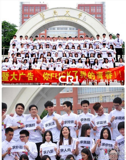 这样的行为仅是“人为亦为”而已。暨大算是海外学生比较多的学校,校风学风应该算比较自由,学生应该有比较广阔的空间发挥自己,然而看图片,这还是一群广告专业的学生,却抄出这样的拉横幅写F字头的文用A4纸打印文字的“创意艺术”,我看了只有一个想法--我现在完全可以理解为什么我们的广告越来越不好看了。
