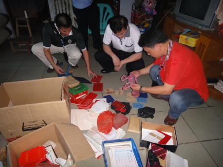 按照公安部“打四黑除四害”专项行动和省委、省政府“三打两建”工作的部署,电白县公安局治安大队以假劣食品、药品、农资、证章等制假售假违法犯罪为打击的重点,通过汇总社会面张贴、喷漆和卡片等广告信息,认真排查制假售假违法犯罪线索。一天前,县公安局治安大队民警在工作中发现一条重要线索,本县观珠镇一路新菜市一居民楼有一个涉嫌伪造、变造、买卖证件、印章的黑窝点。一番侦查后,民警摸清了这个制假窝点的准确位置,并掌握了相关证据。6日20日下午14时许,副县长、公安局长黄晓亲临现场指挥,治安大队组织力量迅速展开行动,民警冲进这个制假窝点时,59岁的邓某辉正与两名购假证者密谈交易。在现场,民警除收缴电脑、激光刻章机、扫描机、刻章模具等一整套制假工具外,还缴获338枚假公章、钢印2枚和1000多件假证“成品”、“半成品”。办案民警介绍,现场的假公章涉及政府、医院、学校及教育、工商等多个部门和单位,制作的假证也是五花八门,包括计生证、毕业证、结婚证、出生证等等,足有一百多种。