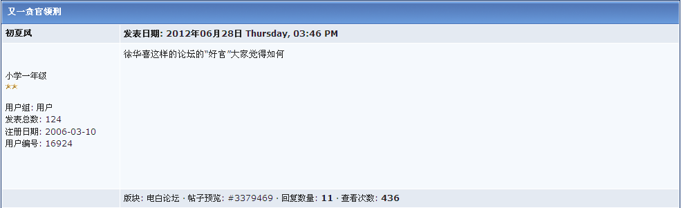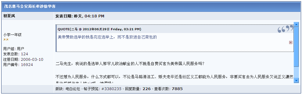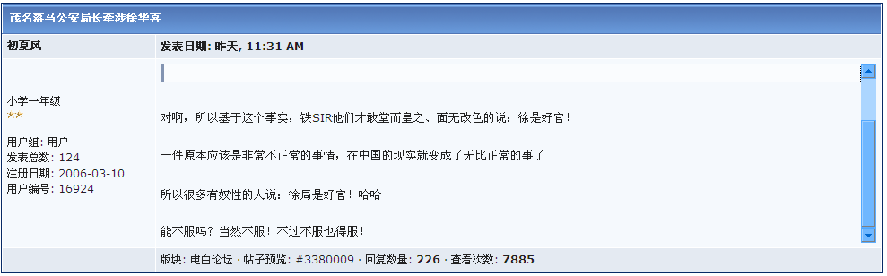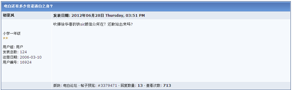 聪明难,糊涂难,由聪明转入糊涂更难。咬住此事不放,不是我本意。徐华喜的情况怎样,更加不了解。评价一个人,有从道德出发的,有从理性出发的,有间杂道德和理性的。既然是到了论坛这个平台,且同情或者竟然至支持徐华喜的ID都难逃奴才之列,连热门ID,B哥也难免被正义人士大生惜乎惜乎之叹,咱这个奴才也来娱乐一把,将楼主在论坛的一些言论,转贴到这贴,供大家茶余饭后聊作谈资,让大家见笑了
