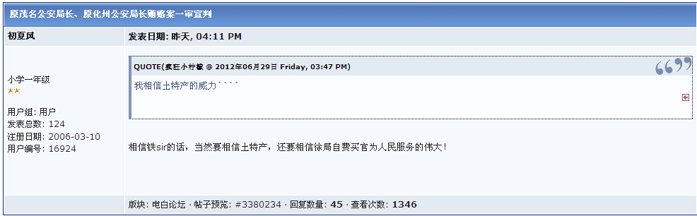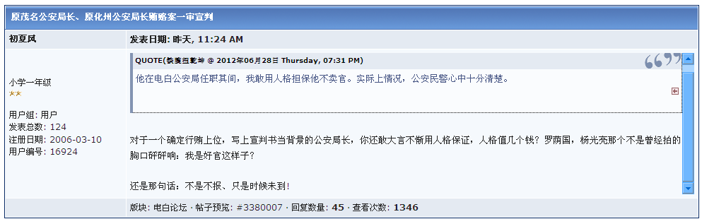 我认为,徐买官的动机,再如何美化,也不可能服众;其买官的行为,必是错的,此为是非问题应明辨;而其买官后为电白治安所作的贡献,程度与认知是各有各感受了,说好与说坏是容许人人表达的,“群众的眼光是雪亮的”。