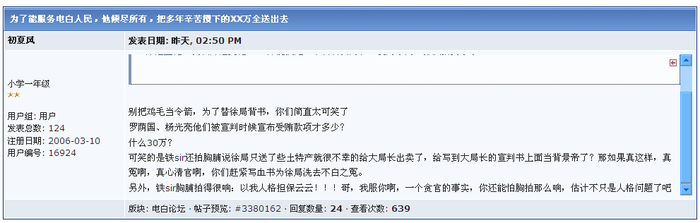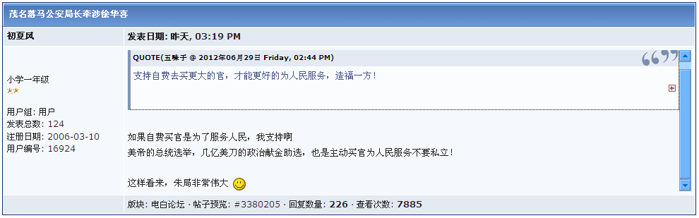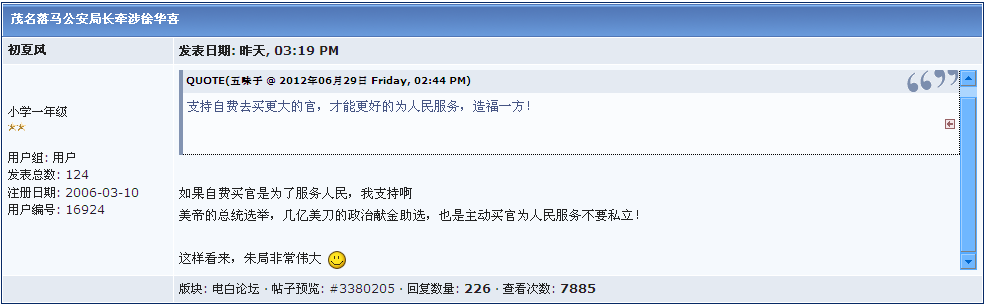 声明,以上下皆为转帖,感慨于铁sir及某些信众提出来的 “贪官是好官”的理念-提炼后的“自费买官为人民服务”的说法