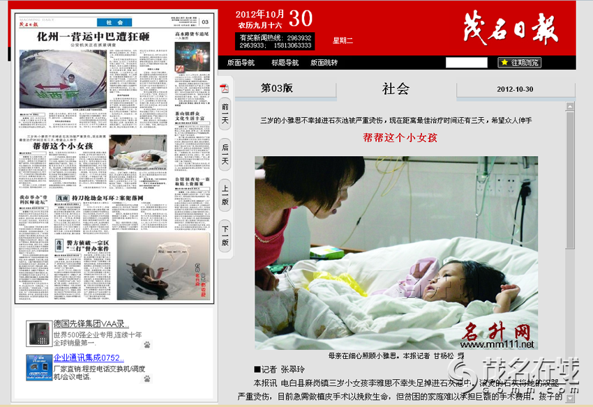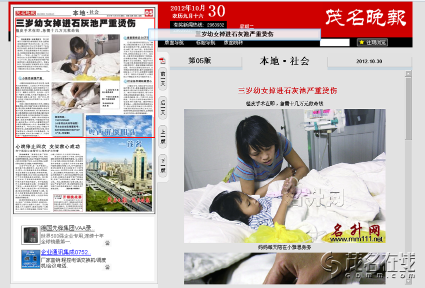 byronroy . 荣誉会员 注册 2005-08-17 消息 70,153 反馈评分 356 点数 191 2012-10-30 #52 昨日,《南方日报》报道了3岁的电白女孩小雅思不慎掉入石灰池,双腿被严重烫伤,亟需尽快接受植皮手术一事;报道同时于南网网络问政平台发布,小雅思的不幸遭遇受到了网友的广泛关注。 热心的网友在微博上不断扩散消息,传递爱心。小雅思的家属告诉记者,昨天还有一些网友志愿者自发前往茂名市人民医院看望小雅思。 许多爱心网友给小雅思的妈妈邓女士的账号上汇去了爱心捐款。记者昨日联系到小雅思的母亲邓女士,她感动地告诉记者,昨日小雅思共收到了3万元左右的捐款,邓女士托南方日报记者向爱心网友表示真诚的感谢。 目前,小雅思的手术费还有7万多元的缺口,小雅思只能在医院继续接受输液和敷药等简单治疗。而离小雅思的最佳治疗时机只剩下2天。广东有爱,网络有情,小雅思的命运需要我们共同伸手援助。 南方日报记者 李秀婷 实习生 冯俊程 援助热线: 15915263843(邓女士) 邓女士的邮政储蓄账号:62218859 23001897197 户名:邓晓霞