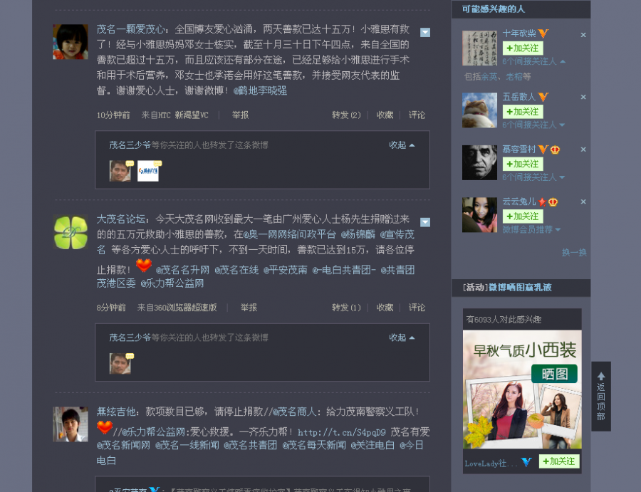 茂名在线网友一颗爱茂心:经茂名在线微博和网友三少爷等人的微博转发,特别是粉丝群巨大的微博局长李晓强转发后,引起很多知名博主的关注,如奥一网问政平台,南方民间智库,凤凰卫视前主持人杨锦麟等人,他们的积极转发让全国很多网友都知晓了小雅思的紧急状况,反响巨大!截至10月29日下午5点,小雅思妈妈的邮储帐号已经收到3万5千元的捐款,其中大部分是国内其他地区网友汇来的,我们相信,这场爱心接力一定会延续下去,油城人的爱心也一直充沛涌动,一定会在3天内为小雅思筹到10万救命钱的!谢谢! 茂名电视台一线新闻已播出新闻,呼吁广大热心市民踊跃捐款帮助小雅思 [attachmentid=302243] [attachmentid=302244]