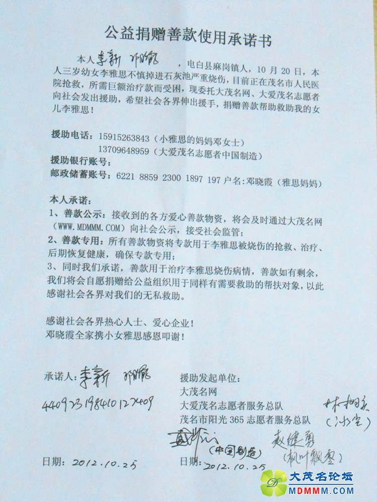 冰 冰尘 大学三年级 注册 2008-01-13 消息 892 反馈评分 0 点数 1 2012-11-01 #92 小雅思的妈妈邓晓霞女士委托大茂名感恩所有关注、帮助援助小雅思烧伤的社会各界,目前捐赠款已达到223400元。小雅思的初期手术工作已经启动,将在下周择日手术。同时,并将严格履行求助之时的善款使用承诺。确保善款的公开,正确使用。如有盈余,将捐赠社会公益帮助他人回馈社会对其的帮助。