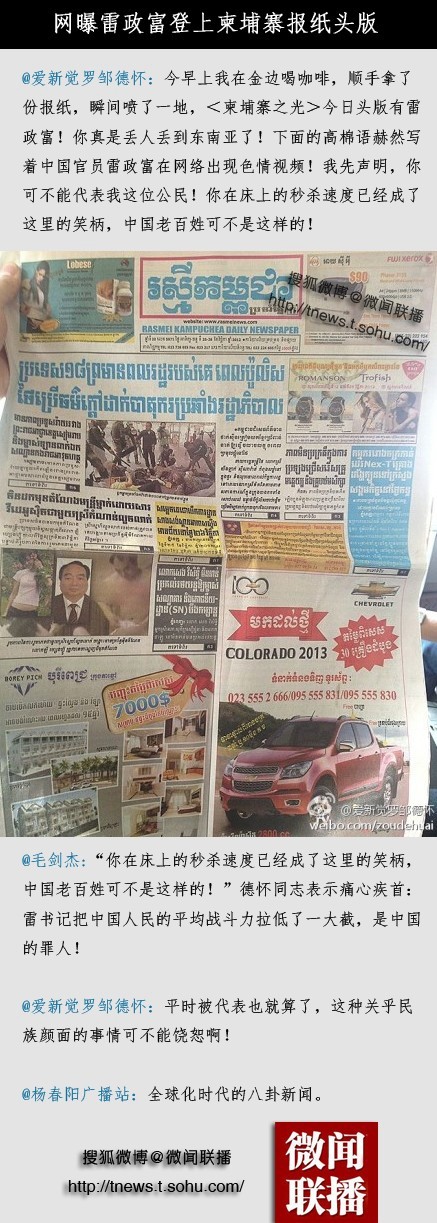 据网友“爱新觉罗邹德怀”微博爆料,25日出版的报纸《柬埔寨之光》头版刊登了不雅视频官员雷政富的报道。“爱新觉罗邹德怀”在微博中表示,“你在床上的秒杀速度已经成了这里的笑柄,中国老百姓可不是这样的!