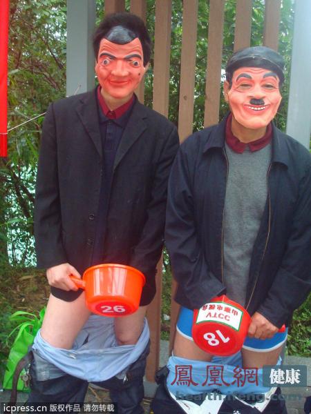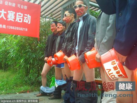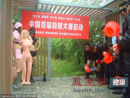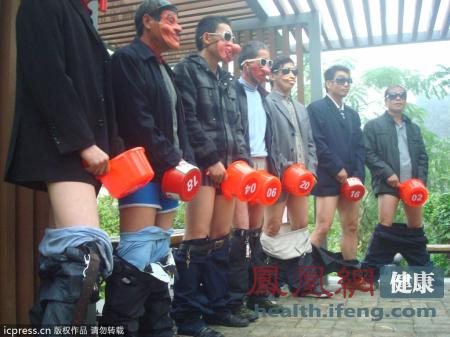 最令人咋舌的集体“打飞机”。2012年11月28日下午,在“世界艾滋病日”即将到来之际,中国首届自慰大赛在深圳梧桐山艺术小镇拉开序幕。参赛男选手手持水瓢遮掩“重要部位”。