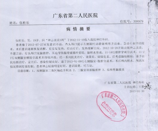 经过一段时间的治疗,桂乐的病情有所好转,头内的积水已经得到控制,现在正在进行康复治疗的阶段。可是让人担忧的是小乐他现在仍然很少说话,这段时间以来才模模糊糊的说了几句话。现在还没能走路,能坐轮椅了。