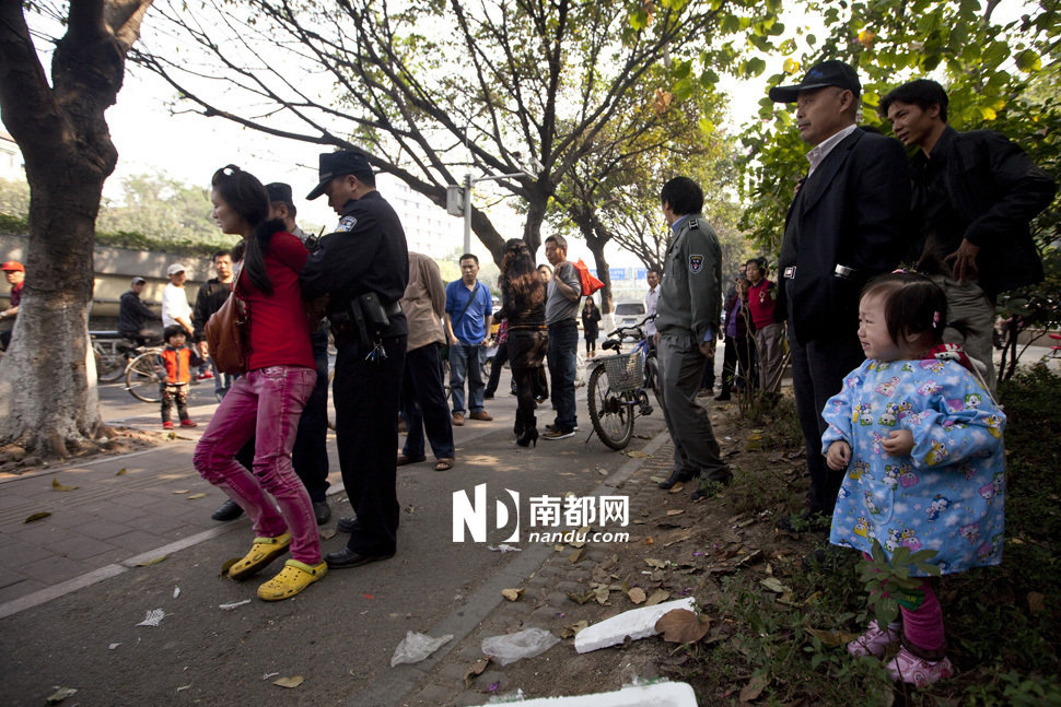 2013年3月6日15时40分,广州大道南靠近客村立交处,城管执法试图赶走一带着小孩的女小贩。双方发生口角后,突然一名制服编号X080324的城管执法人员上去掐住女小贩脖子意图将其放倒。随后,小贩老公到场,发现妻子被警方强行扣押上警车,要求城管下车给出说法,对方不予理睬。南都记者 黎湛均 摄