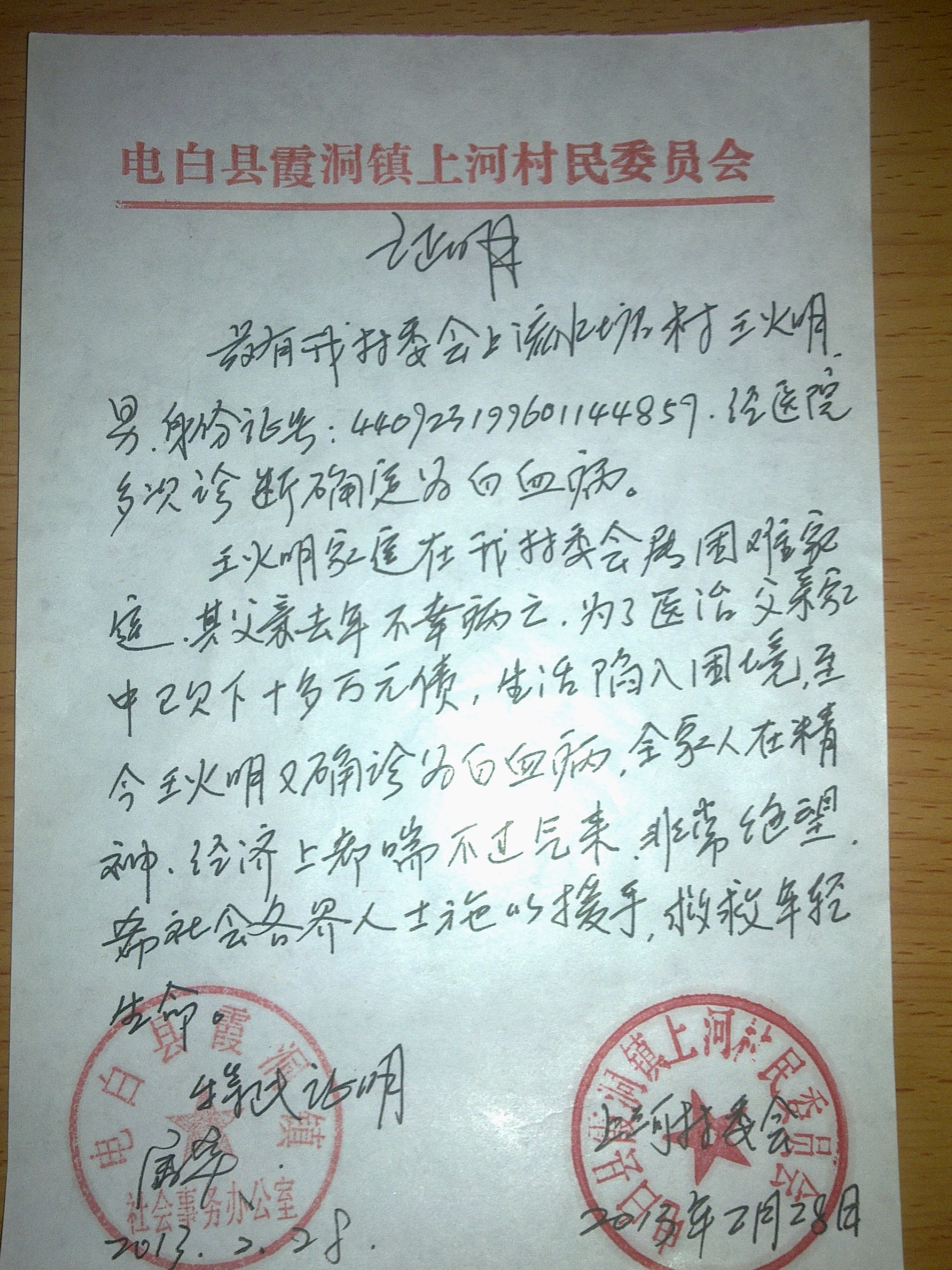 王火明一家五人,父母均靠做水泥工为生,去年其父亲生病后欠下一大笔医疗费用,其父亲最终也因为救治不及时而病逝。为帮其母亲减轻负担,火明跟他的姐姐都辍学外出打工。而更加不幸的是火明外出打工不久也因为身体不适而检查出患上白血病,这一消息无疑给其家里雪上加霜!住院后因为家里实在拿不出那么多钱,即使医生不断追问其家人要不要化疗,其家人都不敢答应,希望社会各界仁人志士能伸出您的援助之手,帮帮这刚失去父亲,又遭遇不幸的青少年吧!