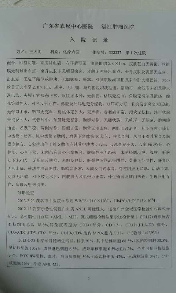 患者姓名:王火明 男 17岁 电白霞洞镇上河流水塘村6号 患急性白血病(白血病M1)