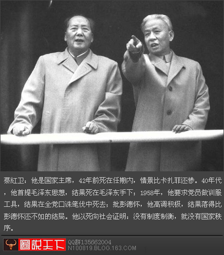 原来看过篇文章说庐山会议本来彭老总是冲着刘的,想搞刘。但毛主席有意维护刘的接班人的地位,所以护着刘。刘知道毛主席的意图后,大胆起来跟彭斗,在这天秤上毛主席偏向了刘,所以庐山会议变成批彭的会议。开始我不信,现在看了王的说话及你自由主义这图话,我有点信了,庐山会议刘成了大赢家,彭却败在刘的手下了。毛成全了刘,又把后来人们的误会全揽在身上了。