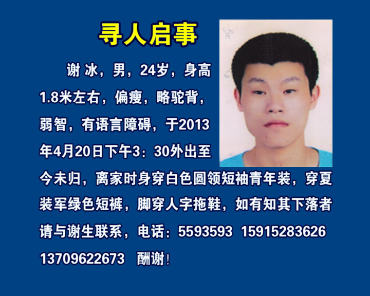QUOTE(wxzhan @ 2013年04月21日 Sunday, 10:14 PM) 这样发寻人启事无疑为大海捞针,至少应该把是哪里人,外出至哪里的地址走失之类的说清楚一下,这样大家留意的时候至少才有个准确度呢……你说呢? [snapback]3531935[/snapback] 、是的,帮你在本地各个群里转发一下,祝早日回家!