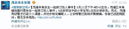 54linqing 小学五年级 注册 2008-07-01 消息 337 反馈评分 1 点数 1 2013-05-21 #1 今天下午4时40分左右,茂港区羊角镇柏屋村委会发生一起持刀伤人事件,6名放学途中的小学生及一名妇女被砍伤。茂名、茂港警方介入。目前伤者无生命危险。 附件 QQ截图20130521213444.png 12.6 KB · 查看: 307