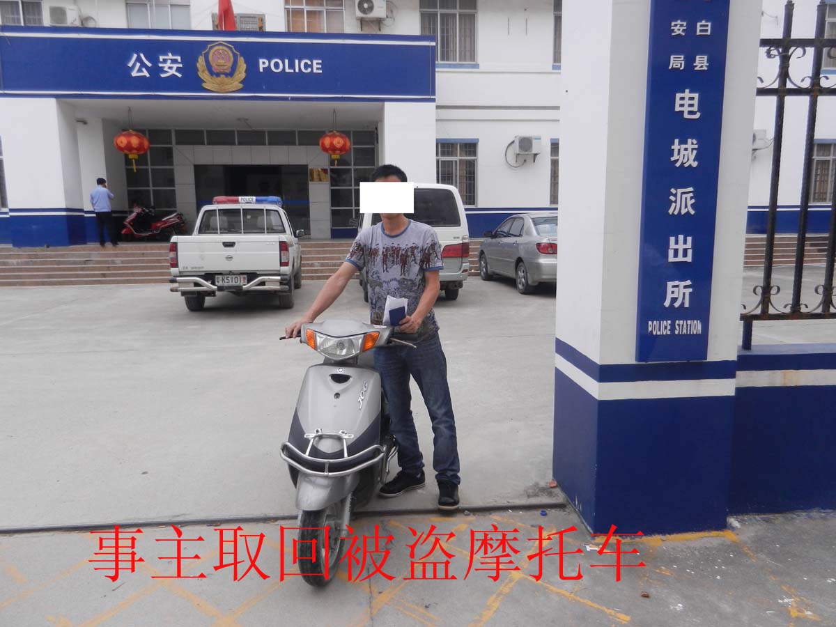 电城派出所自6月1日起通过便衣伏击、着装巡逻、设卡盘查,至今已经追回近十台被盗车辆。6月4日下午14时许,电城派出所伏击组在电城公园又当场抓获一名涉嫌销赃嫌疑人陈XX(已经行政拘留)。该辆车是事主何XX于2004年3月9日在阳江市江城区被盗,事主何XX接到民警报来追回被盗摩托车的喜讯后,很意外的说:“想都不敢想,一辆被盗九年的摩托车还能重回我的手中,看来真的要杀鸡还神啦!”