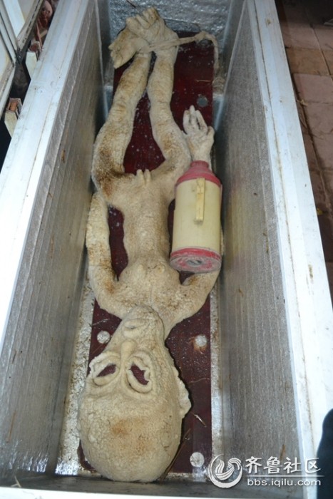 6月7日下午2:00许,李先生带领大家到了他的仓库(位于滨州市滨城区普湖街道办事处扈家村),发现了封藏在冷柜里的“外星人”。在冷库里存放的“外星人”周围有两个干湿度计,据李先生介绍,“这两个干湿度计用于调节湿度和温度的,现在的‘外星人’是经过处理的,并且已经被专家封住,还想贴封条,我没允许。”