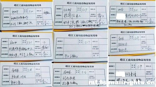 爆料人提供的照片中,不仅有堆成小山的名烟名酒,还有数张“靖江工商局接待物品领用单”,单子上的日期从今年4月23日到6月9日,其“领用部门”一栏中,有来自“公交科”、“办公室”、“局长室”、“人教科”等多个部门,其中还有一个为“放心办”,其领用事由则各有不同。“餐厅是内部食堂,但装修豪华,可与五星级酒店媲美,几乎天天有酒席,顿顿是豪餐。并且,局长朱建忠也几乎餐餐出席,杯杯豪饮。”