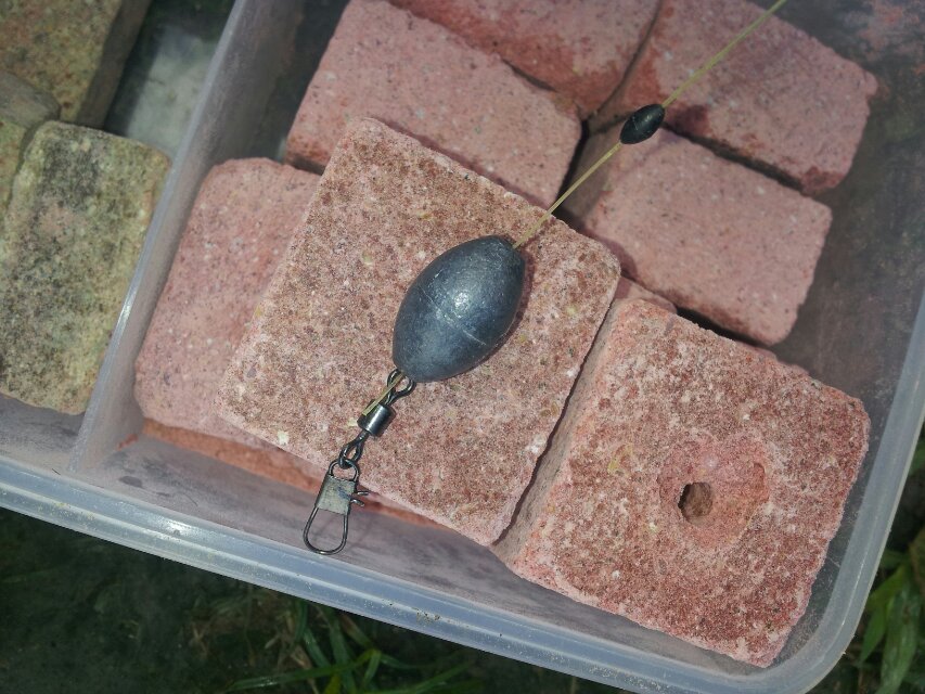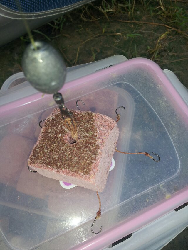 2.你看到这些红色的方块一定好奇吧,不错这些就是饵料了,这种饵料是饼状的,干净方便,买一个保鲜盒装好就行了,最重要这饵料不贵,网上卖是7块一包,一包有十八块 ,一块饵料能泡两个小时(不管有没有上钩损耗不大)