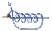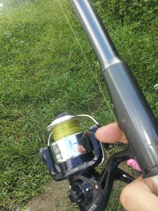 4.当然最简单的也要学会把杆抛出去,杆尾预留30公分长,打开线轮绕线开关,用右手食指勾住线,左手握紧杆的手柄端,然后把钓组成一个抛物线抛出去(这个不好说,自己慢慢尝试),要注意的是,在抛出去后,收紧线时一定要用力拉一下使饵料和勾翻过来,然后用支架把杆放好,挂上响铃。