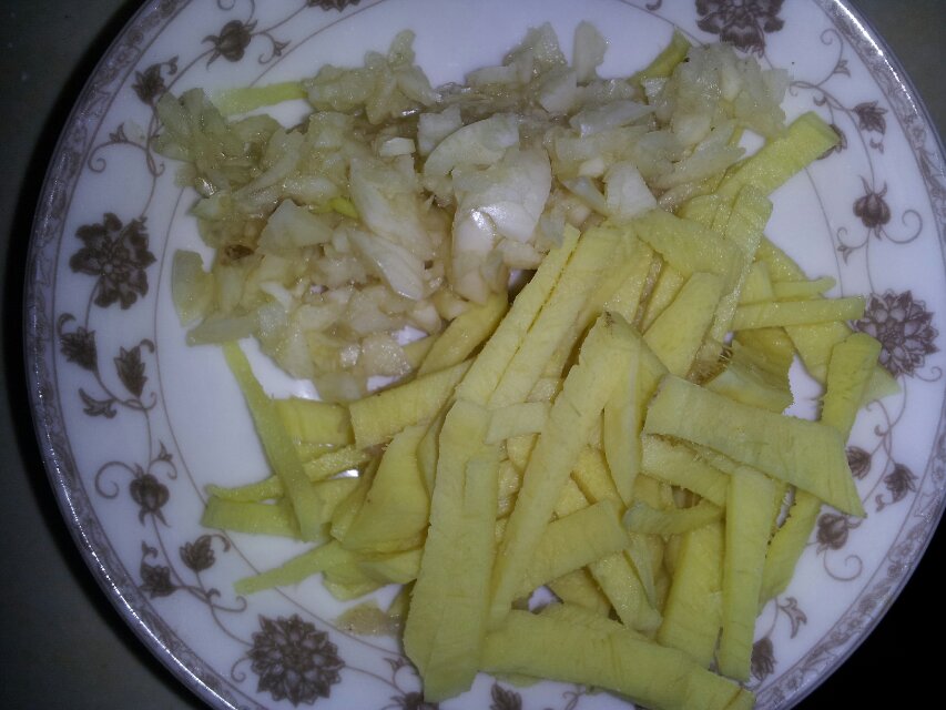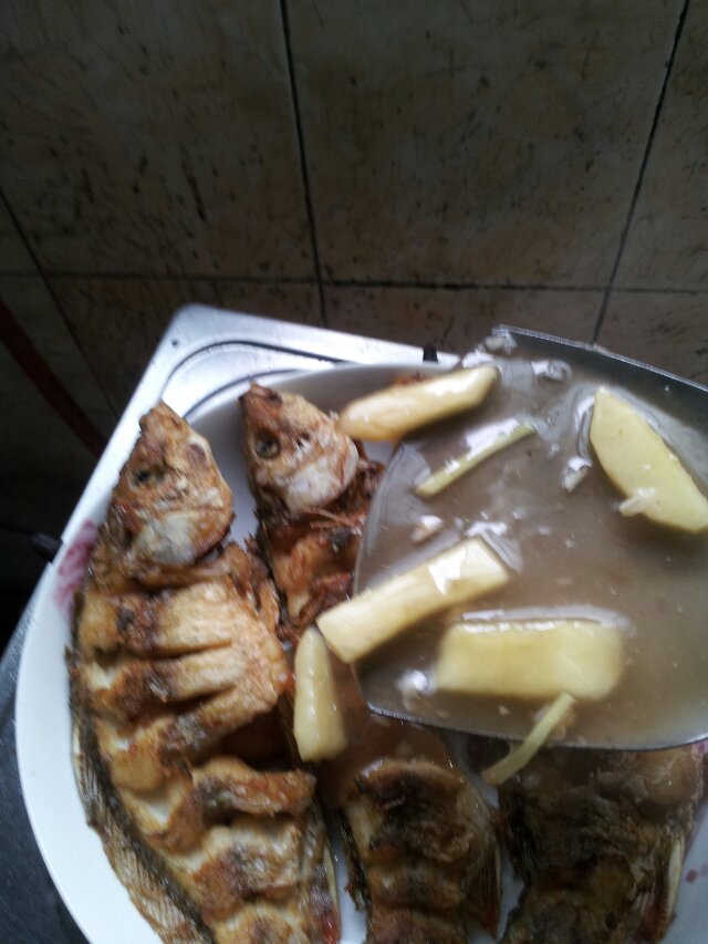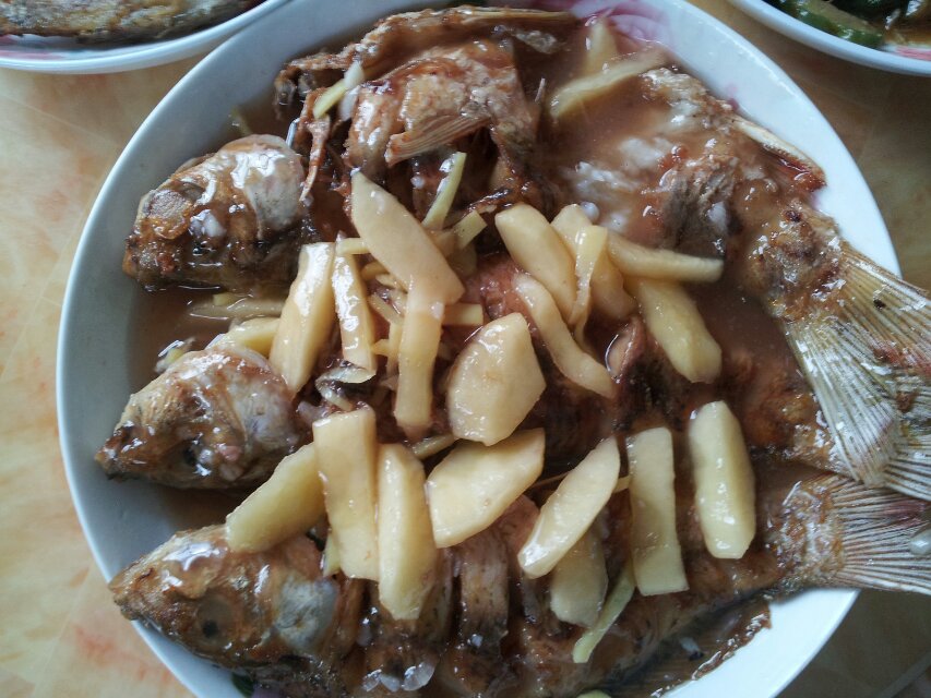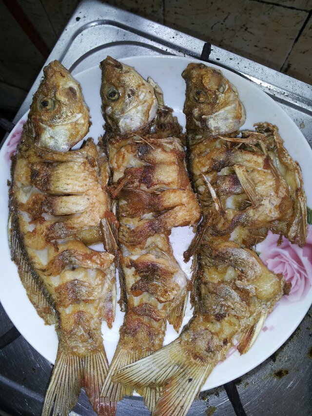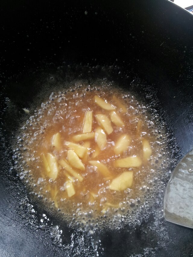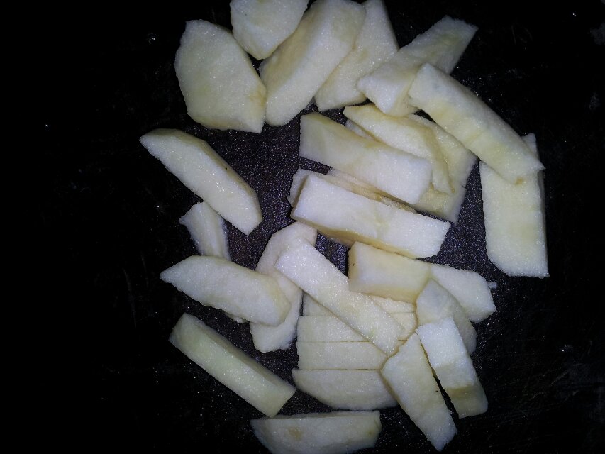 1.把鱼杀了,清理内脏,去鳞,然后抽掉那跟腥筋(网上有不细说),用少许盐和湿淀粉腌制几分钟,再放进油锅里炸,家里油多就一起炸,油少就一条条炸,我家的油快吃完了,所以一条条炸,炸得不怎样。接着还要准备些蒜沫,还有姜丝,辅材就用苹果。