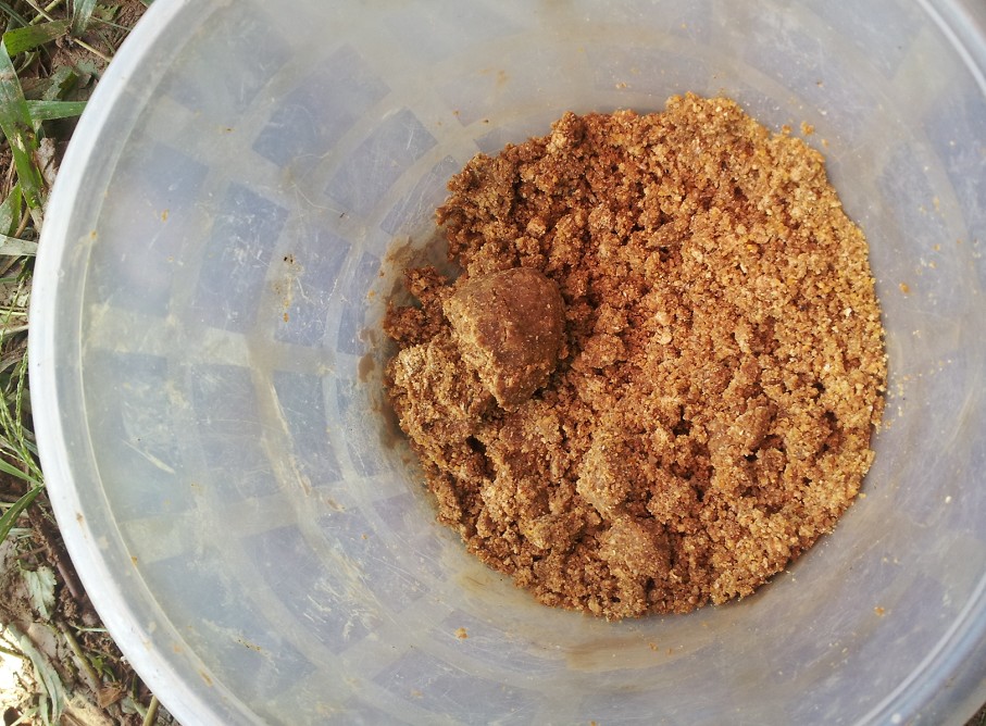 1.把猪料加水捏到差不多粉状,加入油头再捏,分量搭配要注意,油头不能太多太多饵料会泡一整天都不会散开,太少饵料不成形一抛就散了。一般一斤猪料,抓一把油头都够了,反正自己掂量好就行了。[attachmentid=315345]