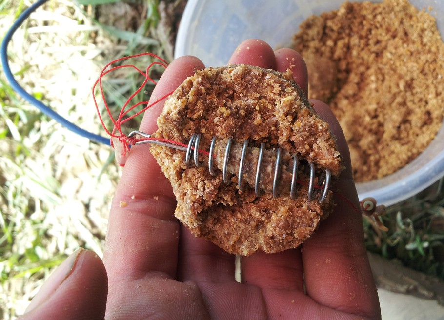 2.配好料之后,就装勾,看图吧,反正把勾藏里面就行了,最后哪个勾可以挂蚯蚓,这样可以钓到罗非或者鲶鱼。[attachmentid=315346]