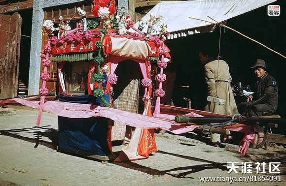 在昆明市内见到的一个色彩鲜艳,用纸花装饰起来的大花轿子。