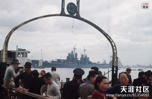 黄浦江上一直停泊着来自各国的船只。图为黄浦江渡口。