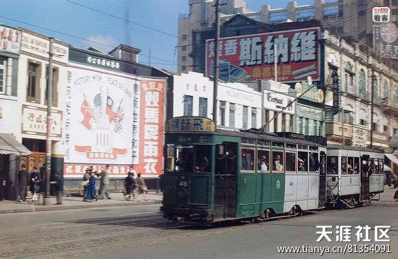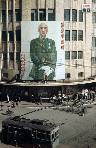有轨电车在战时及战后的许多年里一直行驶在南京东路上,其模样同美国、欧洲及印度的一些城市里的电车一样。街边那张巨型广告画,上面分别是中国、苏联、英国和美国的旗帜,以及“庆祝抗战胜利,庆祝世界和平”的标语。