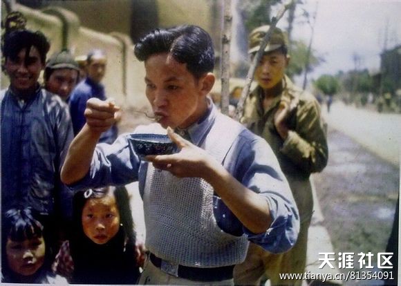 杭州地区的乡村引起艾伦和几个战友的极大兴趣。在机场附近田野里耕作是当地的主要活动,1945年秋天温和的天气最适合各种农作物的好收成。农民们及其家人打着友好手势接待他们,并且乐意被拍照。图为在田间歇息吃饭的一家人。
