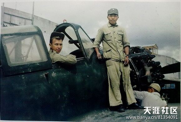 艾伦与一名中国空军技师在一架缴获后被翻新的日军战机上。(威廉?迪柏 摄)
