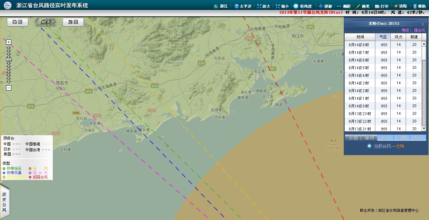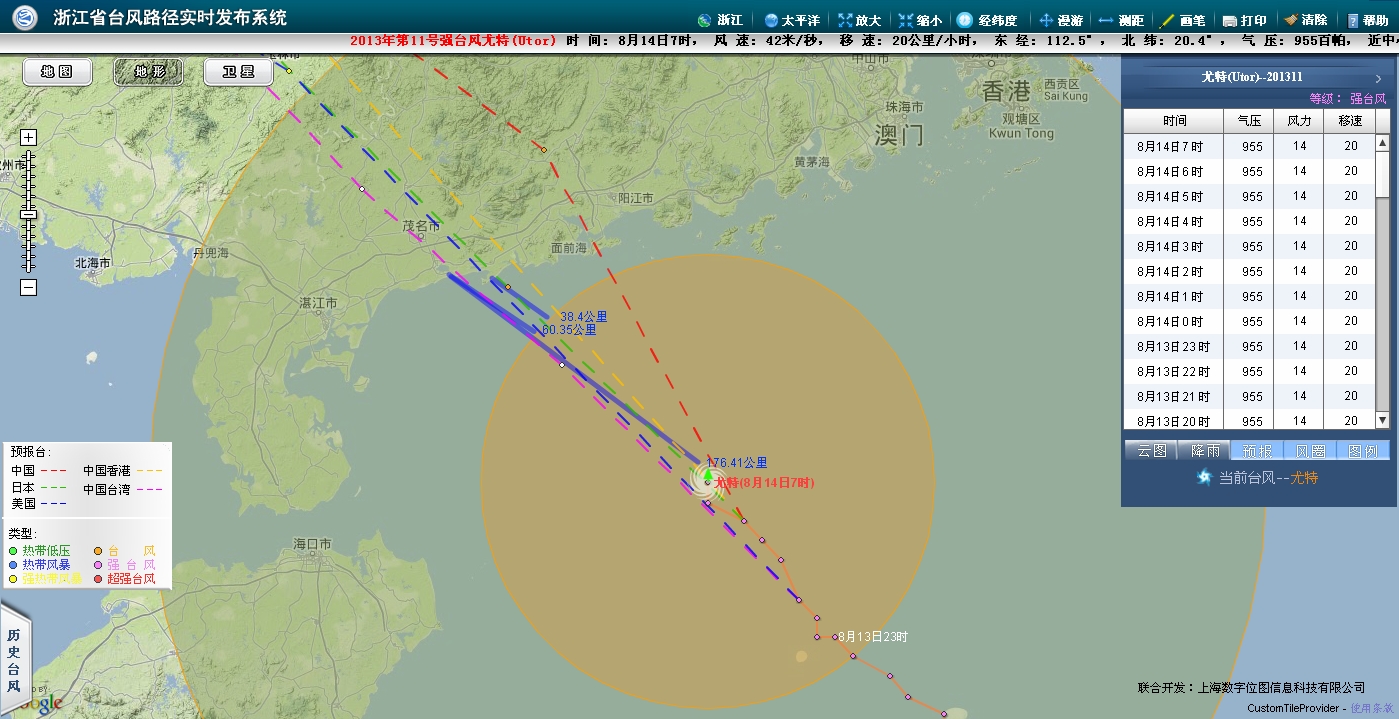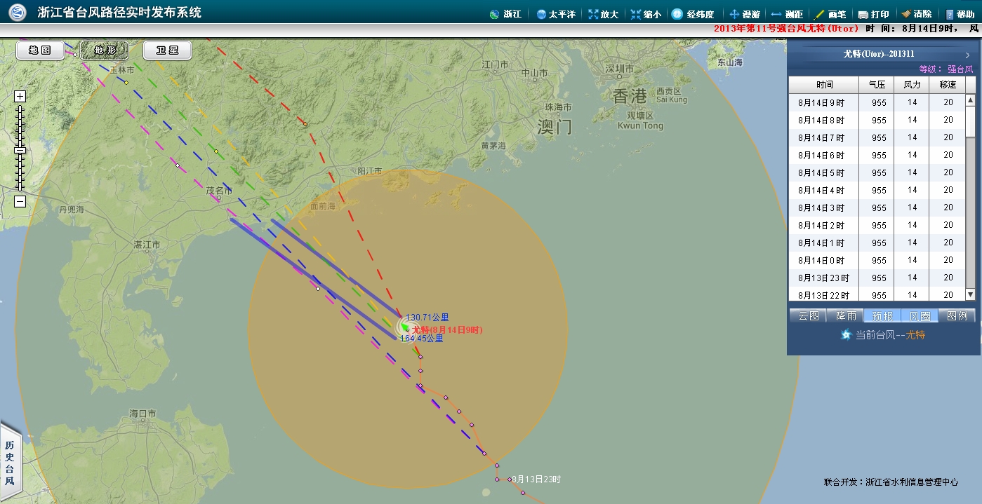 hchcc 荣誉会员 荣誉会员 注册 2004-08-21 消息 7,429 反馈评分 1,830 点数 191 性别 男 2013-08-14 #66 实时:http://typhoon.zjwater.gov.cn/ ,开始偏阳江方向去了。