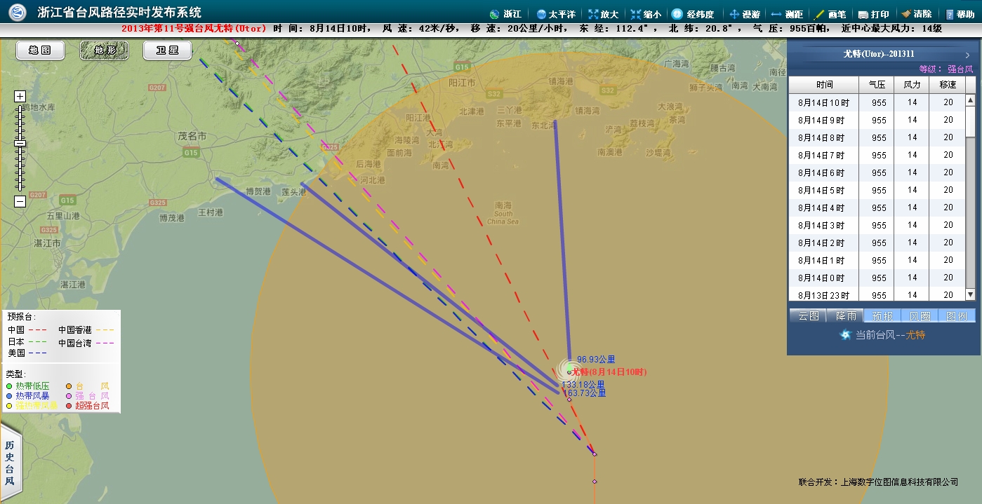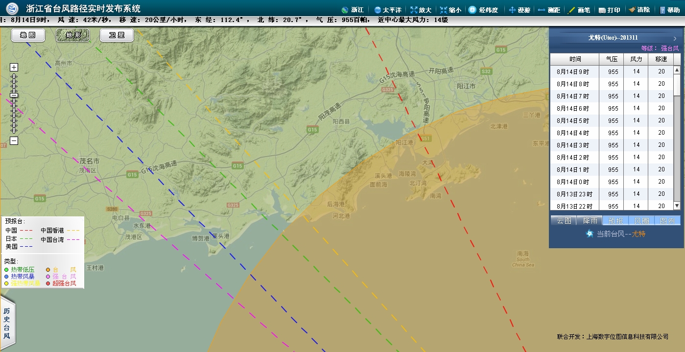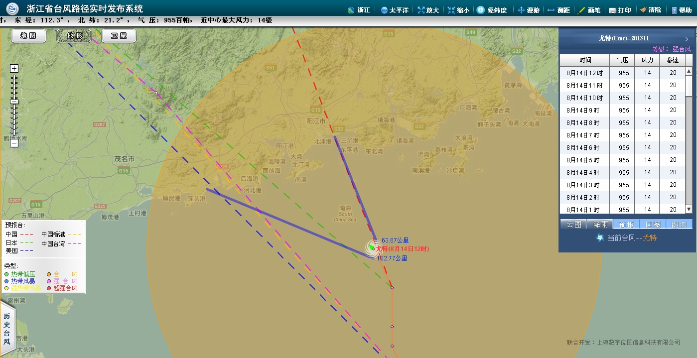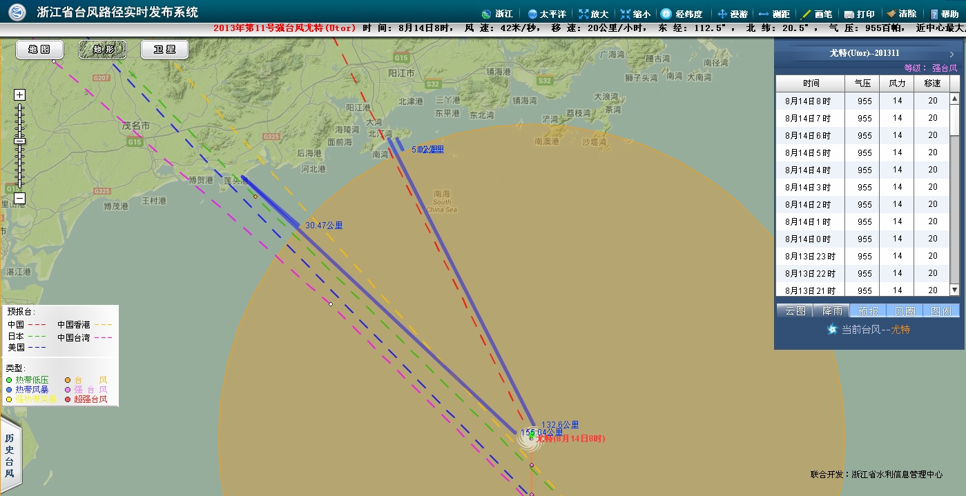 hchcc 荣誉会员 荣誉会员 注册 2004-08-21 消息 7,429 反馈评分 1,830 点数 191 性别 男 2013-08-14 #66 实时:http://typhoon.zjwater.gov.cn/ ,开始偏阳江方向去了。
