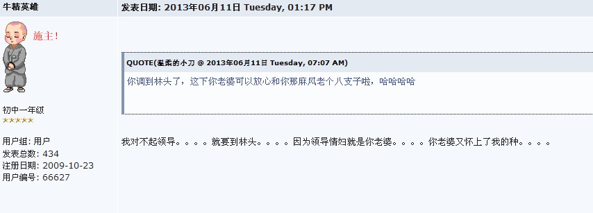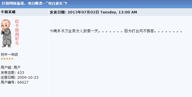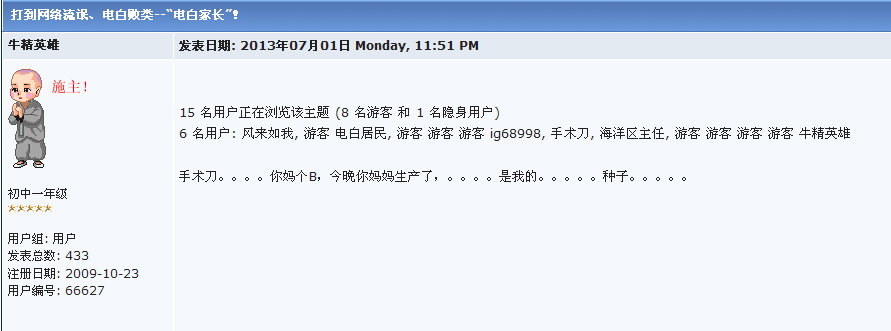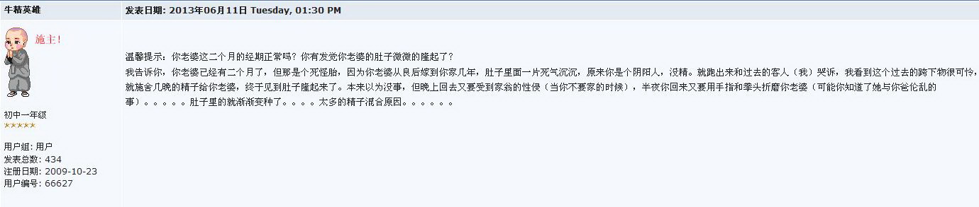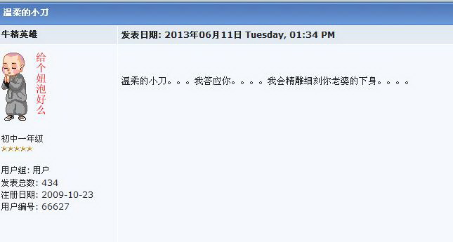 QUOTE(牛精英雄 @ 2013年08月16日 Friday, 11:08 PM) 这个豆腐脑南瓜,他是红党一脉相承的生产物,都有一个特点:台上道貌岸然、富丽堂皇,台下却是偷鸡摸狗、臭气熏天。 说的是,南瓜经常自榜为思想高尚,自视为党的代言人,但却经常发些黄色咸湿的露屁股图片污染环境。 [snapback]3574282[/snapback] 哦,原来是你啊。你的马甲也忒多了点。看看这位君子是如何引领论坛道德风尚的。