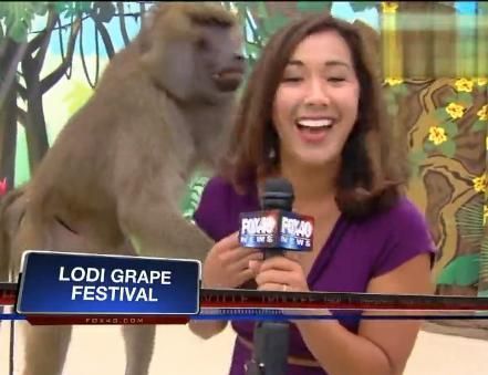 该名女主持名叫塞不丽娜•罗德里格斯,9月12日当天,她在美国加利福利亚州首府萨克拉门托,报道洛迪葡萄节。而正在她在作报道时,这只名叫米奇的狒狒趁机爬到她的身后,并抓住了她的右边胸部。