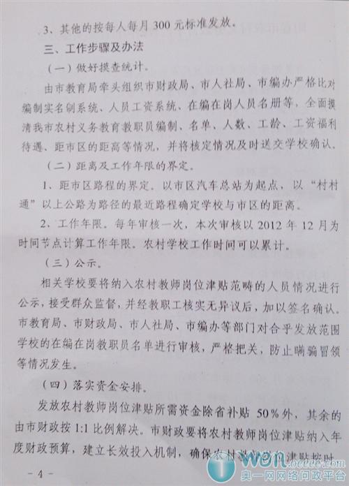 (二)制定实施办法。各县(市、区)可根据本方案要求及当地实际制定本地山区,农村边远地区义务教育学校教师岗位津贴制度实施办法。各地在实施办法中可根据义务教育学校人员的实际情况、所在学校与城区的距离、在农村学校工作的年限等因素分档确定具体的津贴发放办法;对在越边远、越艰苦的农村学校工作和服务年限越长的教师应给予越高档次的岗位津贴;在发放津贴前,应对符合发放要求的人员名单予以公示。各地在制定实施办法过程中应充分征求当地农村义务教育学校人员的意见。各县(市、区)的实施办法请于2 013年4月30日前分别报省财政、教育、人力资源社会保障部门备案。