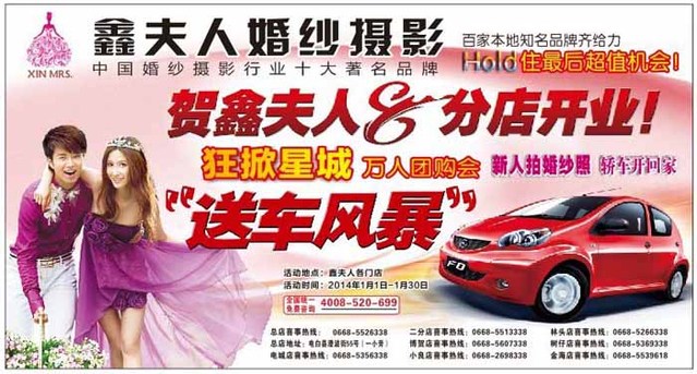 12月28日8:28分电白鑫夫人第8分门市店和婚纱礼服馆即将同时在东湖金海购物广场横空出世,盛大启航,神密面纱即将揭开,这是一场璀璨夺目、空前浩荡的洗礼,2013鑫夫人婚纱礼服馆来了,2014还会远吗?