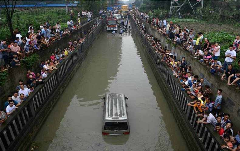 6月20日,成都市降下暴雨后,涵洞中被淹的面包车和小货车。围观的人们怀疑面包车里有人,最终发现没有人,面包车驾驶员早已成功逃生。19日晚四川省大部分地方降下暴雨,最大降雨量达240.4毫米,共发生雷电58418次,其中成都发生雷电云地闪击11064次。